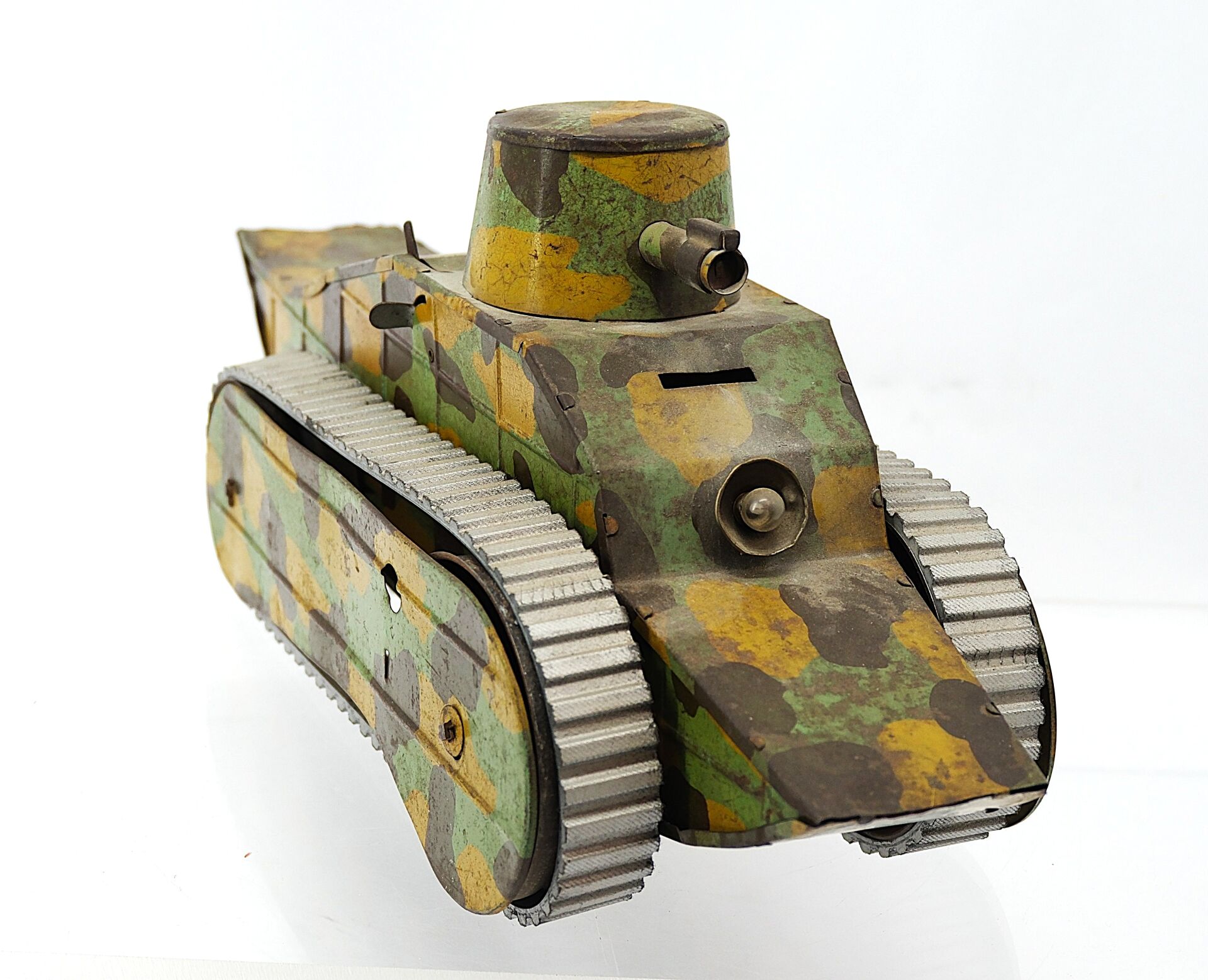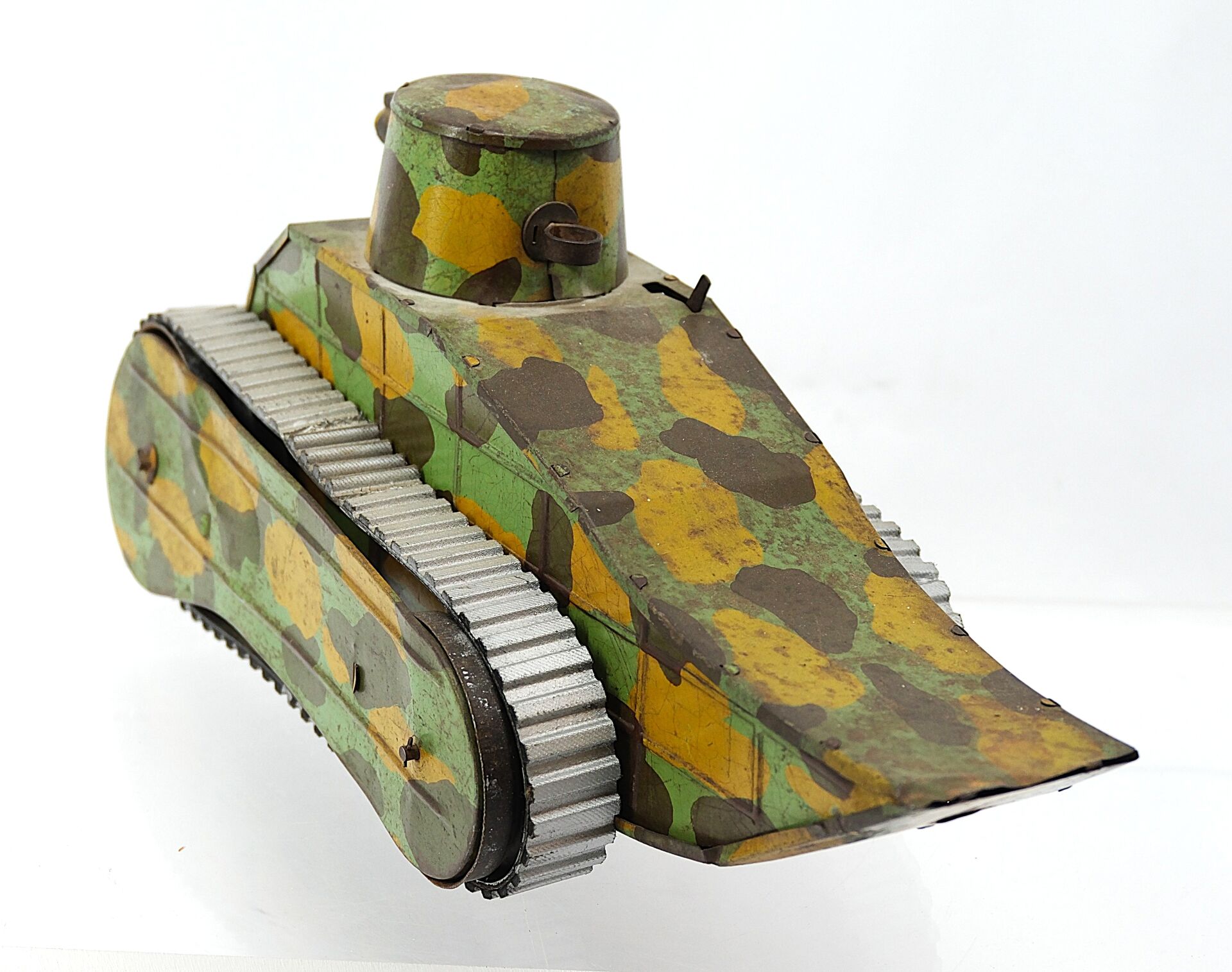 En tôle peinte camouflée, chenilles en caoutchouc.