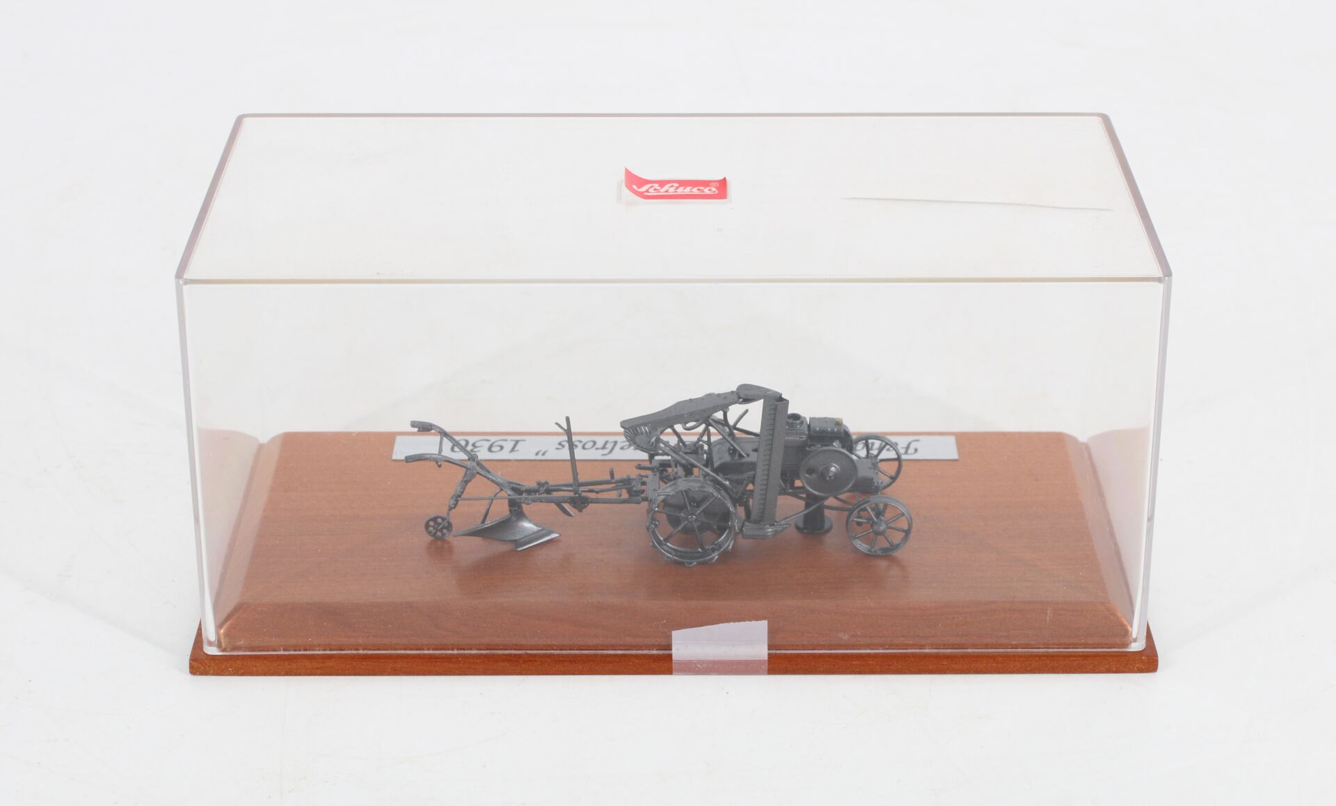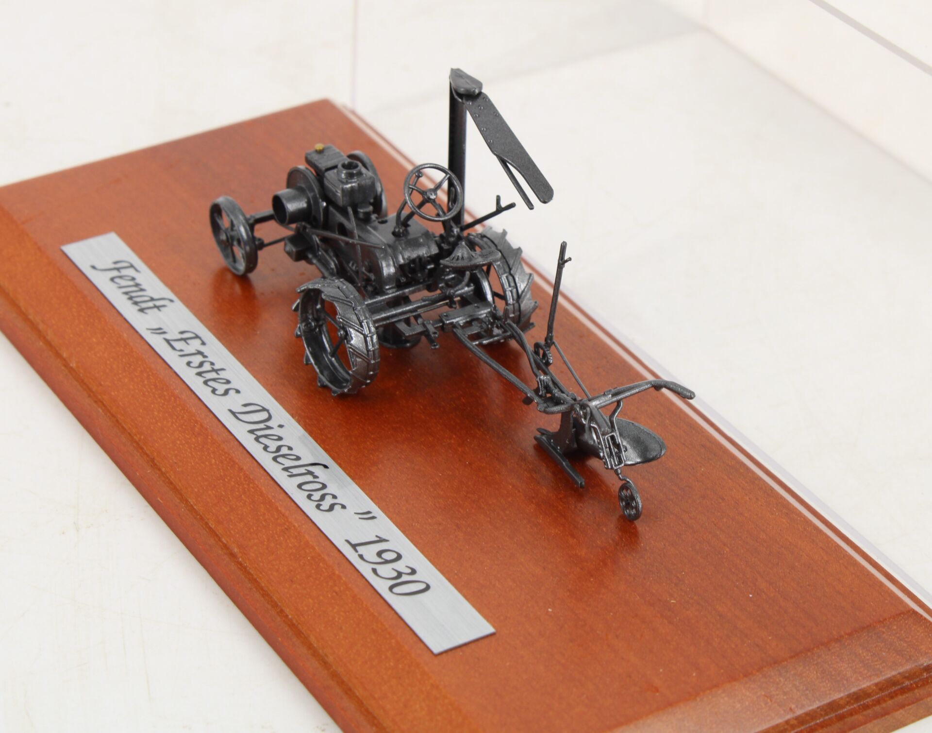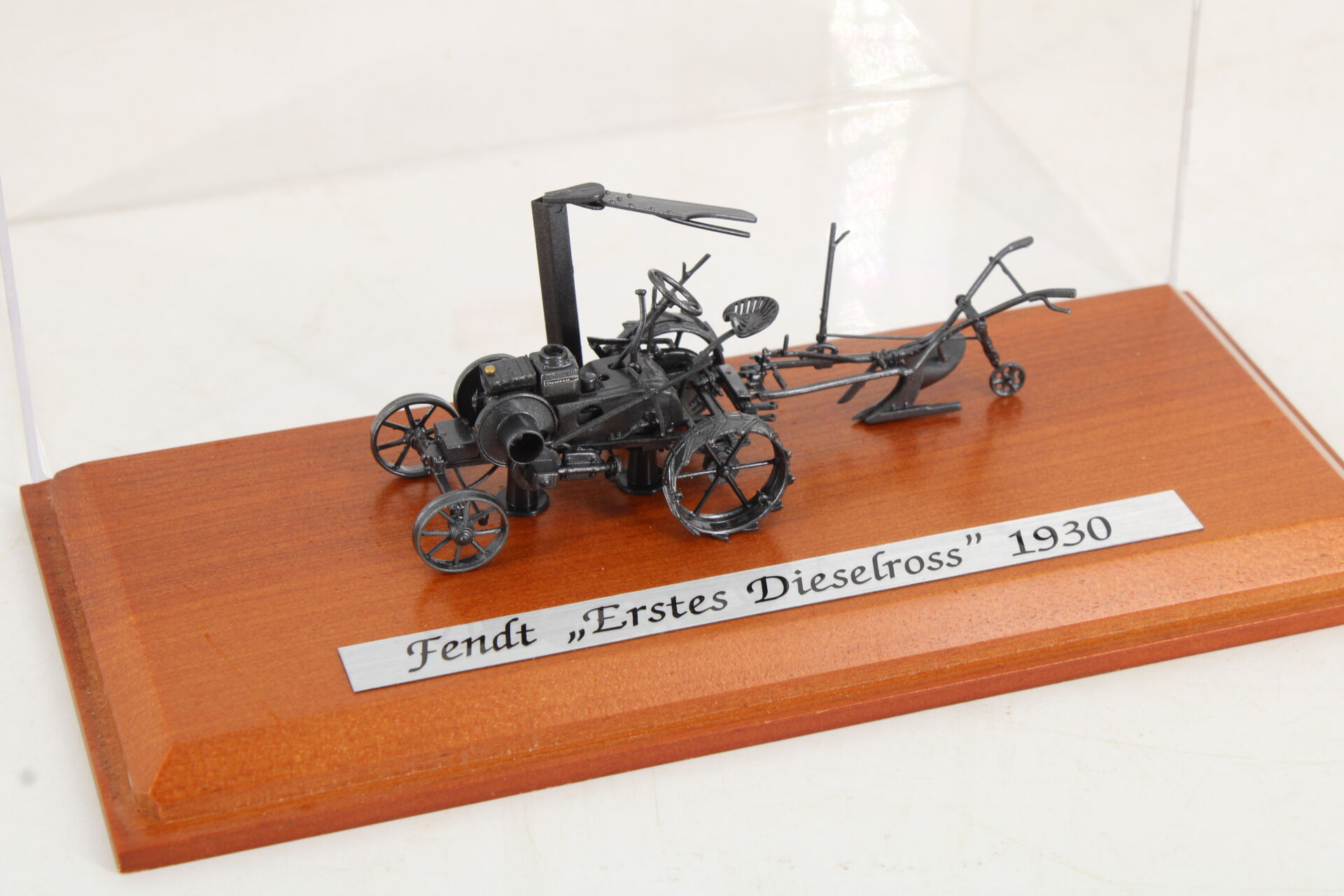 Metal model with wooden base and plexiglass cover.